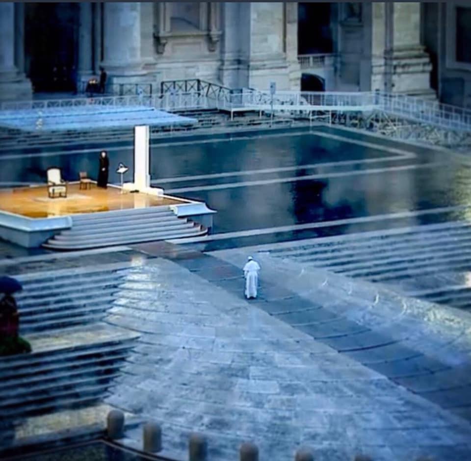 A parte gli scherzi, credenti o non credenti, è surreale e storica questa immagine del papa in una piazza San Pietro totalmente vuota.